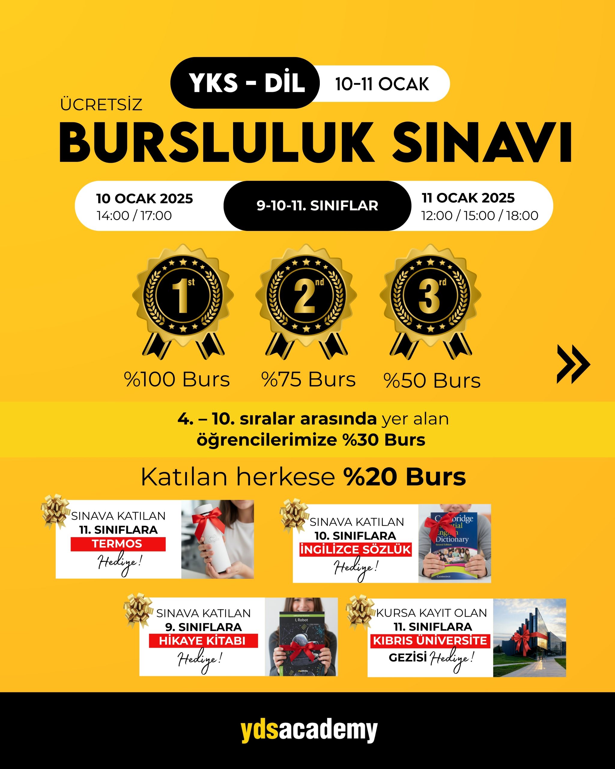 Sınavımıza katılan tüm 9. sınıf öğrencilerine İngilizce Hikaye Kitabı, 10. sınıf öğrencilerine Cambridge Sözlük, 11. sınıf öğrencilerine Termos hediye edilecektir.